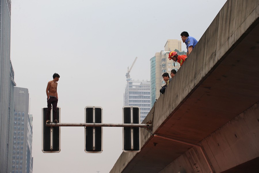 Read moreA man stands on top of a set of traffic signals as he threatens to jump on May 24, 2016 in Changsha, Hunan Province, China. Police officers, fire workers and traffic police set up an inflatable safety mattress but he missed it when he fell after trying to jump onto the overpass. An ambulance hurried the man to nearby hospital. The reasons for his actions are unknown. #