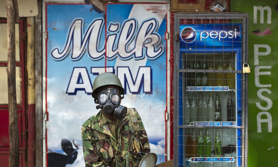 Read moreA Kenyan policeman wears a gas mask as he stands in from of a milk dispenser at a kiosk, during running battles between police firing tear gas and protesters throwing rocks, in the Kibera slum of Nairobi, Kenya, on May 23, 2016. Kenya's police shot, beat, and tear-gassed opposition demonstrators across the country as protestors tried to gather to call for the electoral commission to be dissolved due to allegations of bias and corruption. #