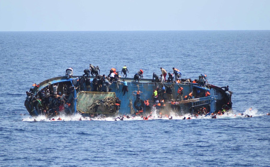 Read moreMigrants are seen on a capsizing boat before a rescue operation by the Italian navy ships “Bettica” and “Bergamini,” off the coast of Libya, in this handout picture released by the Italian Marina Militare on May 25, 2016. #