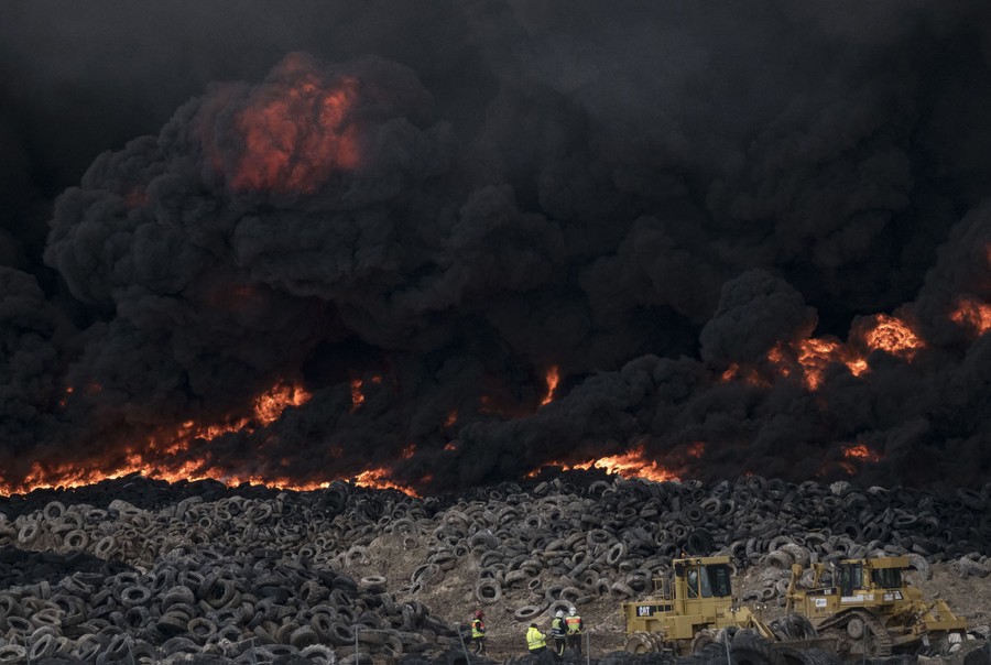 Read moreTires burn in an uncontrolled dump near the town of Sesena, after a fire broke out early on May 13, 2016. A huge waste ground near Madrid where millions of tires have been dumped burned Thursday, releasing a thick black cloud of toxic fumes that officials worry could harm residents nearby. #