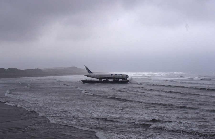 Read moreBad weather surrounds a Boeing 767 airplane as it arrives onto Enniscrone beach after it was tugged from Shannon Airport out to sea around the west coast of Ireland, on May 7, 2016. It is destined for local funeral director David McGowan's proposed Glamping Village to be used as accommodation in Sligo, Ireland. #