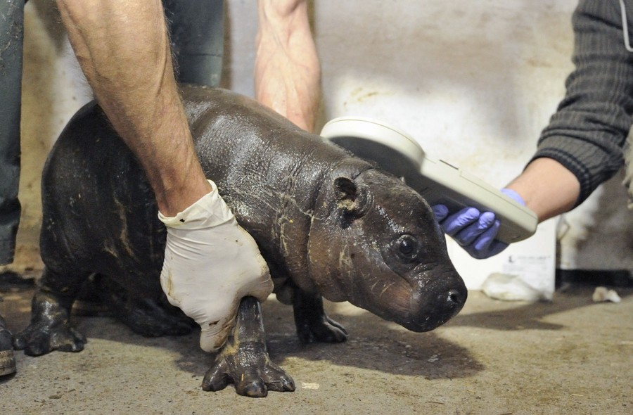 Read moreA two-week old pygmy hippopotamus (Choeropsis liberiensis) undergoes a routine medical check in its enclosure in Szeged Nature Reserve in Szeged, Hungary, on May 10, 2016. #