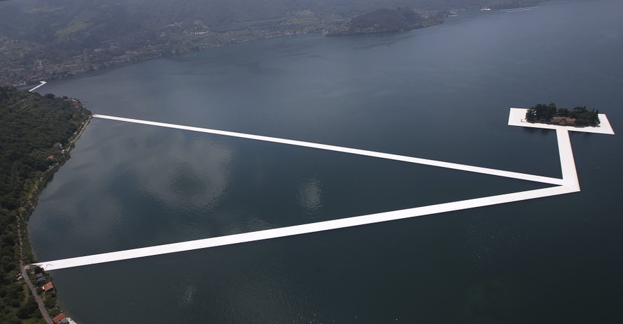 Read moreAn aerial view of the in-progress installation ‘The Floating Piers’ by Bulgarian-born artist Christo Vladimirov Yavachev known as Christo, on Lake Iseo, northern Italy, on June 7, 2016. Some 200,000 floating cubes create a 3-kilometer runway to be clad in bright yellow fabric, connecting the town of Sulzano to the small island of Monte Isola for a 16-day outdoor installation opening on June 18. #