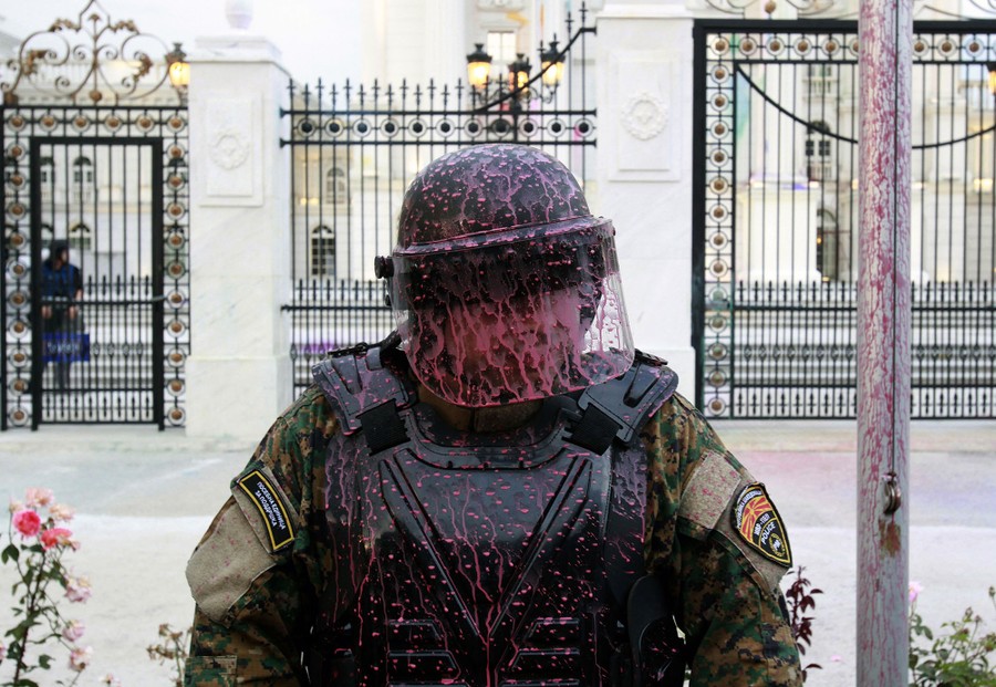 Read moreA police officer is splashed after protesters threw balloons filled with colored paint at the government building during an anti-government protest in Skopje, Macedonia, on June 6, 2016. Just before the protest, Macedonia's conservative president Gjorge Ivanov has canceled pardons for top political and administrative officials, issued two months ago, that triggered international condemnation and weeks of street protests. #