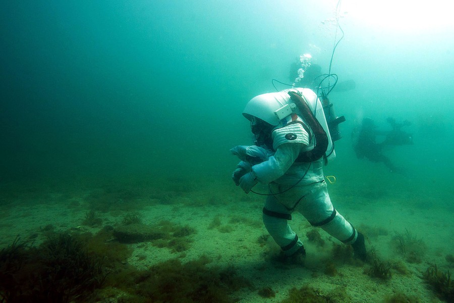 Read moreA Comex diver wearing a Gandolfi space suit walks underwater during a “Moonwalk” operation in the Mediterranean sea at the Frioul islands near Marseille, southern France, on June 8, 2016. The diver uses a computer underwater to drive a robotic vehicle called “Yemo,” testing for future space missions on the moon or Mars. #