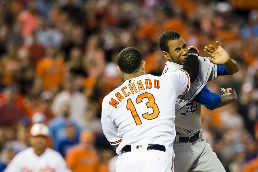 Read moreManny Machado of the Baltimore Orioles punches the pitcher Yordano Ventura of the Kansas City Royals, charging the mound after being hit by a pitch in the fifth inning during a MLB baseball game at Oriole Park at Camden Yards on June 7, 2016, in Baltimore, Maryland. Machado and Ventura were ejected from the game. #