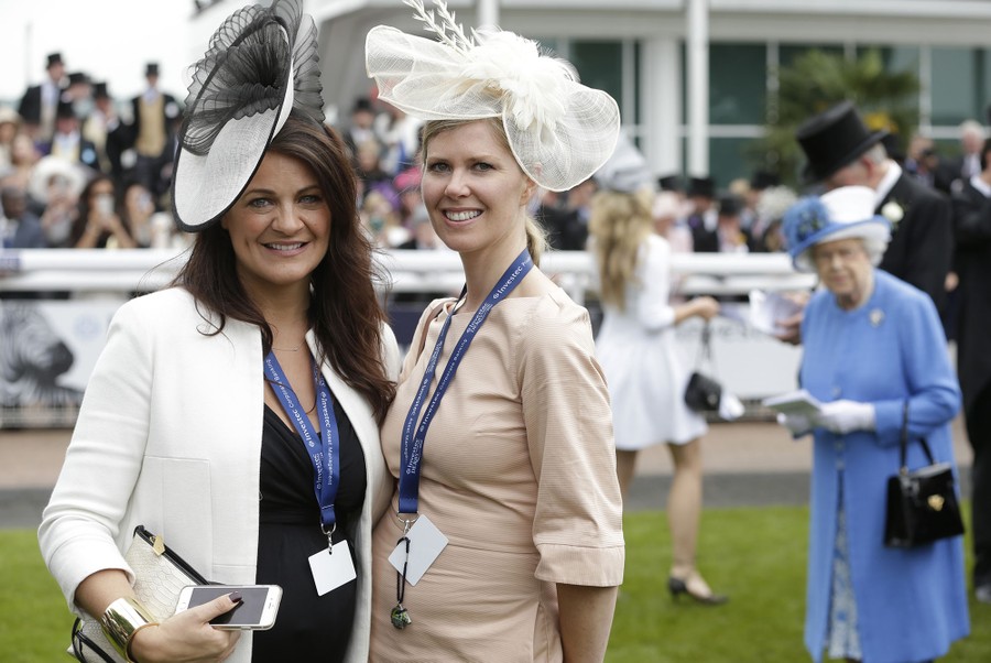 Read moreRacegoers at the Investec Derby Festival pose for a picture with Queen Elizabeth in the background, in the parade ring, at Epsom Racecourse in Surrey, England, on June 4, 2016. #