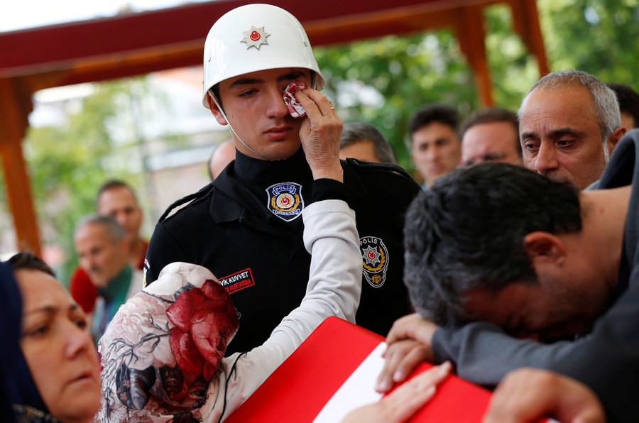 Read moreA woman wipes the tears of an honor guard as he stands next to the coffin of the police officer Kadir Cihan Karagozlu who was killed in Tuesday's car bomb attack on a police bus, at Fatih mosque in Istanbul, Turkey, on June 8, 2016. #