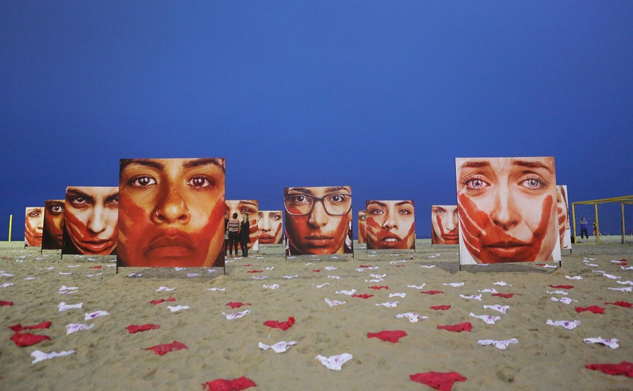 Read morePhotographs by Marcio Freitas of models portraying women who are abused are displayed on Copacabana beach with 420 pairs of underwear at a demonstration against violence against females on June 6, 2016, in Rio de Janeiro, Brazil. The demonstration was put on by the NGO Rio de Paz who said the 420 pairs of underwear represent the number of women raped in Brazil every 72 hours. The protest follows the gang rape of a 16-year-old girl in late May in Rio de Janeiro. #