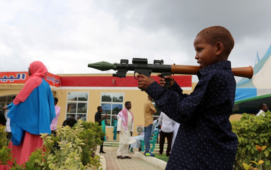 Read moreA Somali boy plays with a toy model of a rocket-propelled grenade (RPG) after attending Eid al-Fitr prayers to mark the end of the fasting month of Ramadan in Somalia's capital Mogadishu, July 6, 2016. #