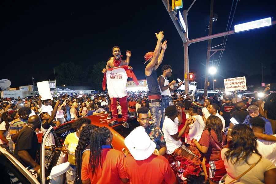 Read moreProtesters stand on cars as they congregate at N. Foster Dr. and Fairfields Ave., the location of the Triple S convenience store in Baton Rouge, Louisiana, July 6, 2016. Alton Sterling, 37, was shot and killed outside the store by Baton Rouge police. #