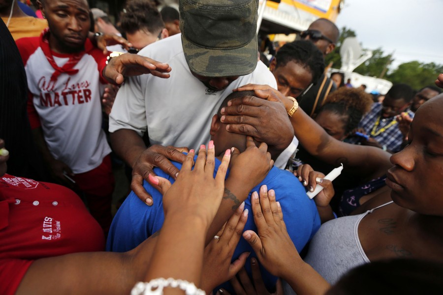Read moreCameron Sterling, son of Alton Sterling, is comforted by hands from the crowd at a vigil outside the Triple S convenience store in Baton Rouge, Louisiana, July 6, 2016. Alton Sterling, 37, was shot and killed by Baton Rouge police outside the store where he was selling CDs. #