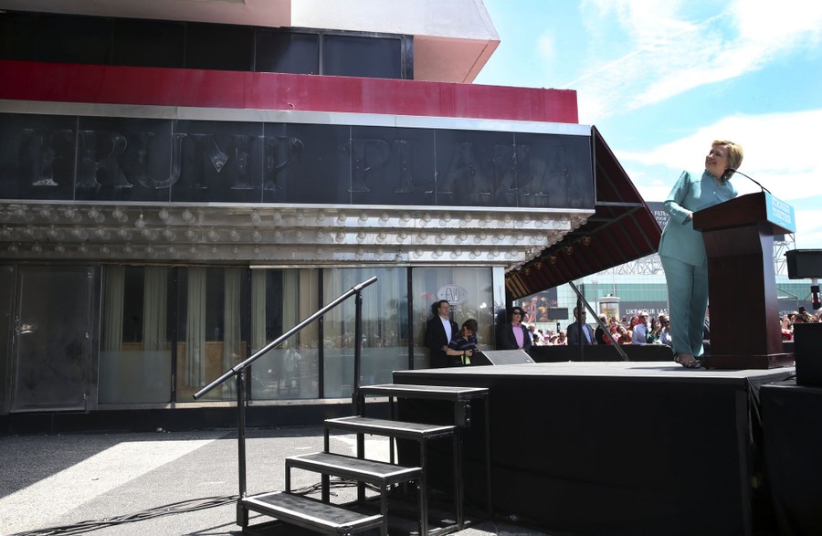 Read moreDemocratic presidential candidate Hillary Clinton looks back at the faded sign of the former Trump Plaza as she speaks in Atlantic City, New Jersey, July 6, 2016. Trump Plaza closed permanently on September 16, 2014. #