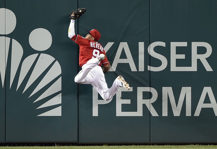 Read moreWashington Nationals center fielder Ben Revere hits the wall after catching a fly ball hit by Cincinnati Reds' Jay Bruce for the out during the sixth inning of a baseball game, July 2, 2016, in Washington, D.C. #