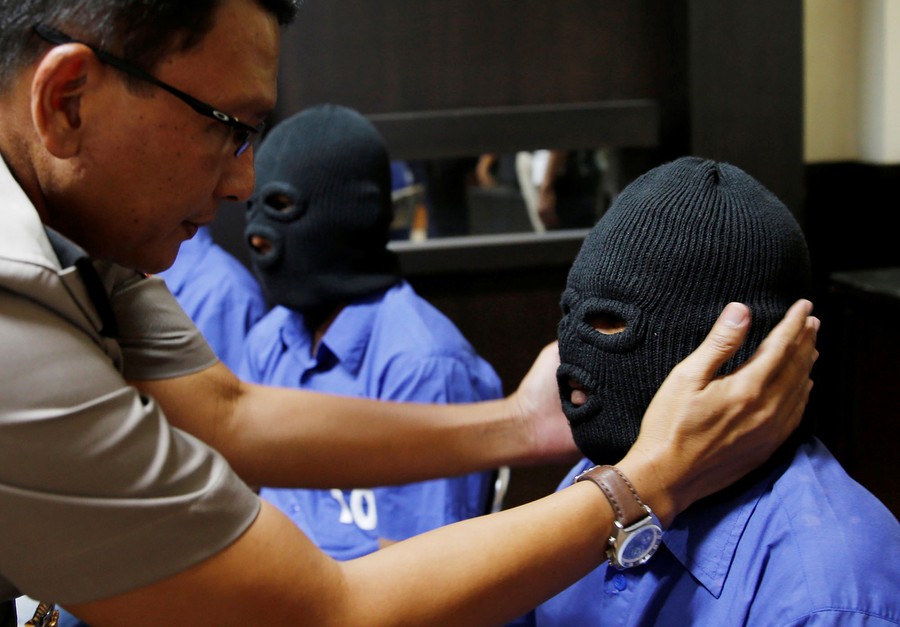 Read moreAn Indonesian police officer adjusts the head cover of a suspected drug smuggler before he and others are displayed to reporters at the National Narcotics Agency office in Jakarta, Indonesia, on July 27, 2016. #