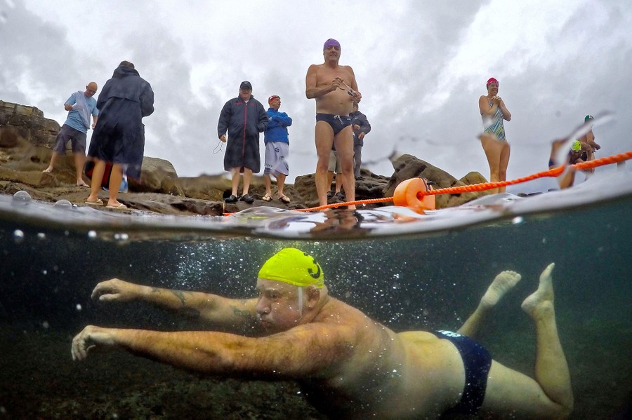 Read moreA member of the Maroubra Winter Seals swimming club prepares to dive into a rock pool as a fellow member swims underneath him at Maroubra Beach in Sydney, Australia, on June 19, 2016. #