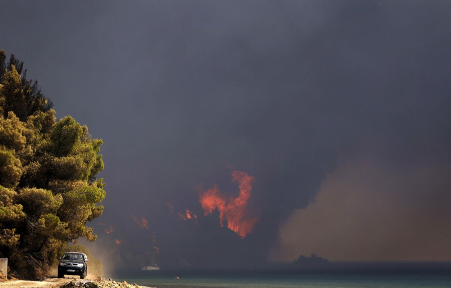 Read moreA resident drives his car next to the beach as a fire burns a forest near the coastal village of Limni on the island of Evia, about 160 km (100 mi) north of Athens, on August 1, 2016. Nearly 200 firemen, assisted by water-dropping aircraft, fire engines and volunteers, are fighting a large forest fire that has raged through the Greek island of Evia for the past three days. #