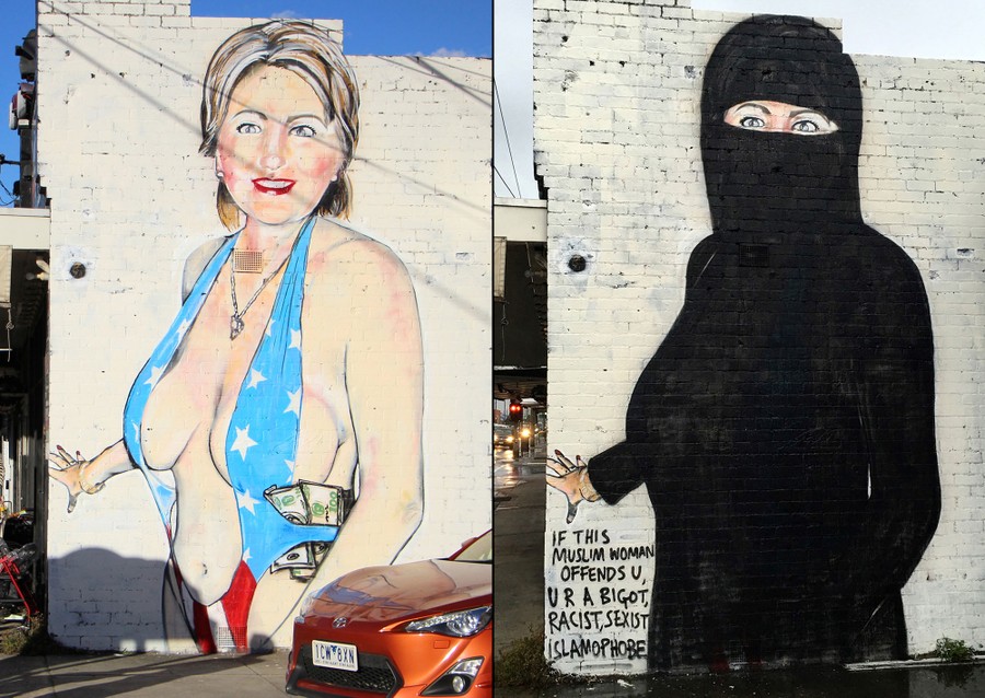 Read moreA combo picture shows a mural painted by street artist Lushsux, bearing the image of U.S. Democratic Party nominee for President Hillary Clinton wearing a stars-and-stripes themed swimsuit stuffed with cash (left) pictured on July 31, 2016 and on August 1, 2016 covered up in Islamic dress, features on the wall of a business in the Melbourne suburb of Footscray in Australia. The local city council had deemed the original mural offensive and requested that the artist remove it. He responded by painting over it, covering Hillary Clinton in a niqab. #