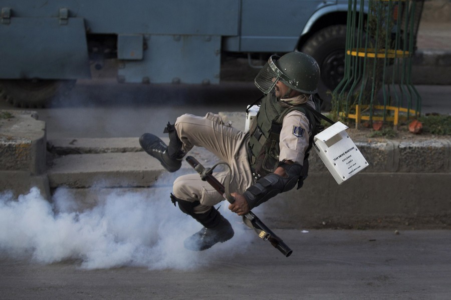 Read moreAn Indian paramilitary soldier falls down as he tries to kick back an exploded tear gas shell thrown back at them by Kashmiri Muslim protesters at the end of a day long curfew in Srinagar, Indian controlled Kashmir, on August 8, 2016. #