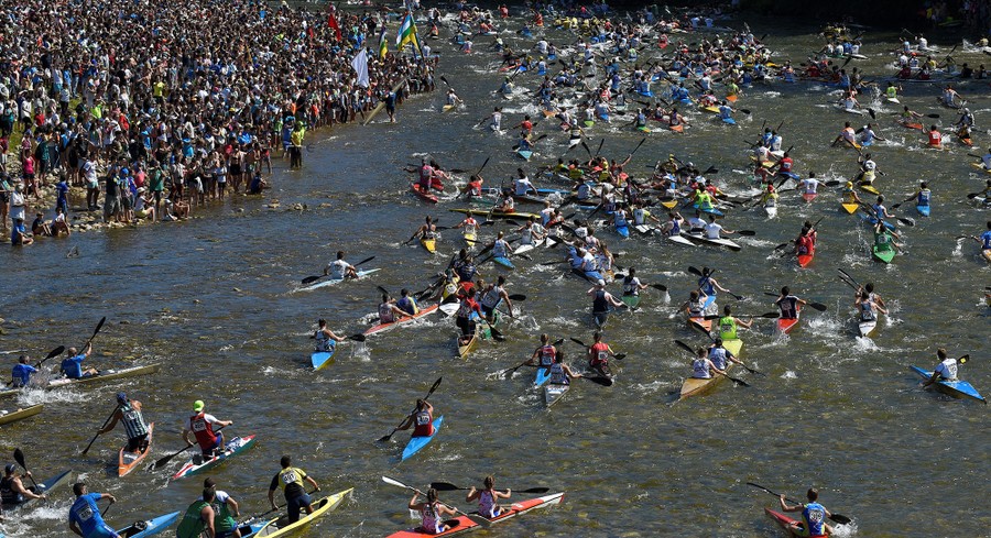 Read moreCanoeists start the annual International Descent of the River Sella event, in which participants from all over the world race along a 20km stretch of the river that starts in Arriondas and ends in the seaside resort of Ribadesella, Spain, on August 6, 2016. #