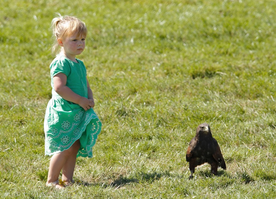 Read moreMia Tindall, great-grandchild of Britain's Queen Elizabeth, walks toward a Harris's hawk as she watches a bird of prey display on day 2 of the Festival of British Eventing at Gatcombe Park in Stroud, England, on August 6, 2016. #