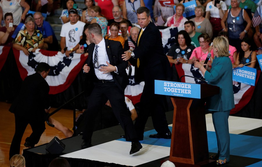 Read moreSecret Service officers work to secure U.S. Democratic presidential nominee Hillary Clinton after a protester jumped into the buffer during a rally at Lincoln High School in Des Moines, Iowa, on August 10, 2016. #