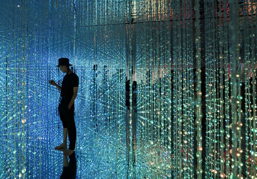 Read moreA visitor uses a smartphone as he looks at a digital installation titled "Wander through the Crystal Universe" presented by teamLab, an art collective, during the DMM.PLANETS Art by teamLab exhibition on August 8, 2016, in Tokyo, Japan. #