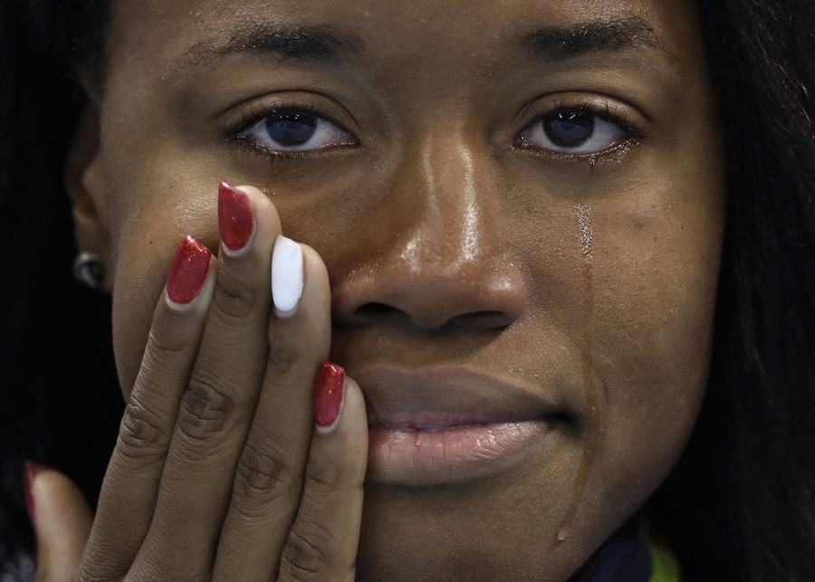 Read moreUnited States' gold medal winner Simone Manuel cries during the medal ceremony for the women's 100-meter freestyle final during the swimming competitions at the 2016 Summer Olympics, on August 12, 2016, in Rio de Janeiro, Brazil. #