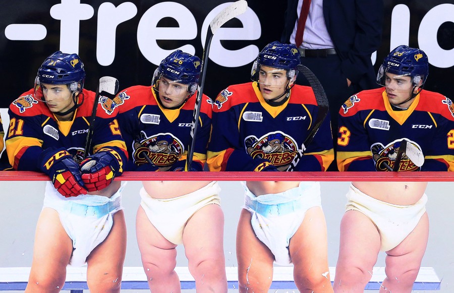 Read morePatrick Fellows, Allan McShane, Carson Edwardson, and Shaun Bily, of the Erie Otters, sit on the bench during the first period of an Ontario Hockey League game against the Niagara IceDogs at the Meridian Center in St Catharines, Ontario, Canada, on October 6, 2016. #
