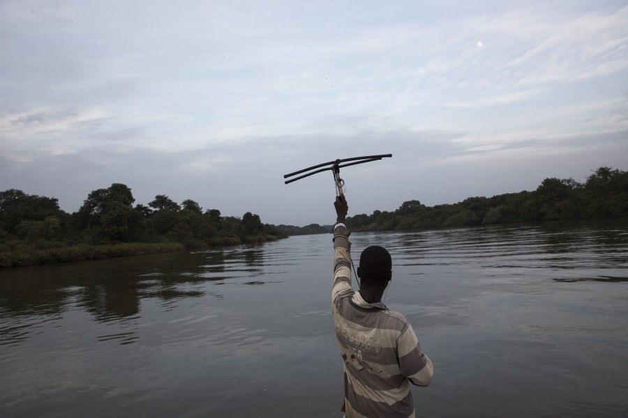 Read moreCCC member Mamadi Camara conducts monitoring work using satellite tracking equipment on the River Niger at dawn near the CCC on November 23, 2015. A group of chimpanzees released in 2008 are constantly monitored, to prevent conflict with people that live around the park. #