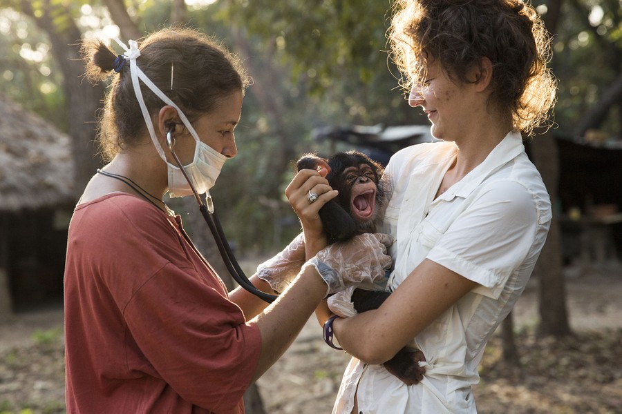 Read moreSpanish veterinary volunteer Camille Lemaire (left) performs a health check on new arrival Kandar on November 28, 2015 in Somoria, Guinea. Kanda, a five month old chimp arrived at the CCC after being rescued by authorities from traffickers and will spend his first three moths with surrogate mother Anissa Aidat, 23, from France. #