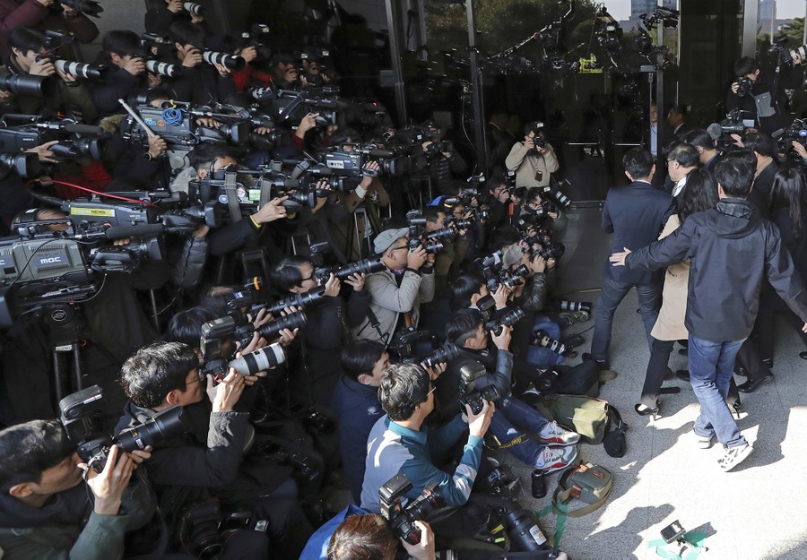 Read morePhotographers and TV camera crews record a former presidential secretary Ahn Jong-beom upon his arrival at the Seoul Central District Prosecutors' Office in Seoul, South Korea, on November 2, 2016. South Korean prosecutors requested an arrest warrant for a longtime friend of President Park Geun-hye on Wednesday over allegations of influence-peddling and other activities that have triggered a huge political scandal that threatens Park's leadership. #