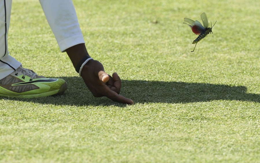Read moreSri Lanka player Dilrwuan Perera prompts a flying insect off the pitch during the test cricket match against Zimbabwe at Harare Sports Club in Harare, Zimbabwe, on October 31, 2016. #