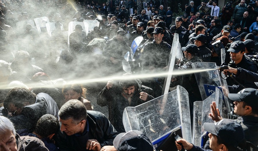 Read moreTurkish police use pepper spray as they arrest protesters during an anti-government protest on November 4, 2016 in Ankara, Turkey. Co-leaders of the pro-Kurdish political party Peoples' Democratic Party (HDP) Figen Yuksekdag and Selahattin Demirtas were detained, along with at least other nine members of parliament (MPs), as part of a counter-terrorism investigation following a police raid in the HDP party headquarters. The HDP is accused by the Turkish government to have links with the Kurdistan Workers' Party (PKK) militant group, an accusation the HDP strongly denies. #