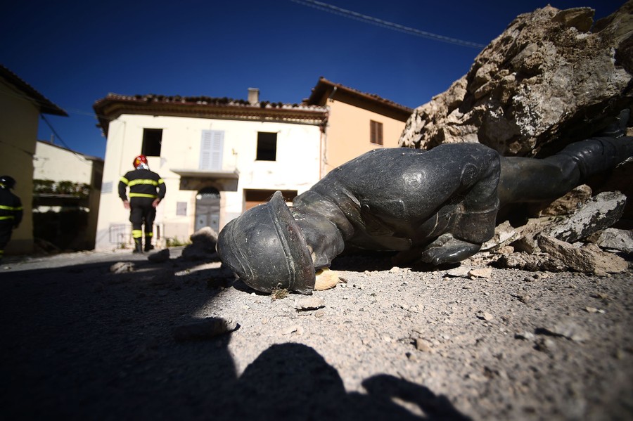 Read moreThe statue of a memorial lies on the ground in the village of San Pellegrino near Norcia, on November 1, 2016, two days after a 6.5 magnitude earthquake hit central Italy. It came four days after quakes of 5.5 and 6.1 magnitude hit the same area and nine weeks after nearly 300 people died in an August 24 quake that devastated the tourist town of Amatrice at the peak of the holiday season. #