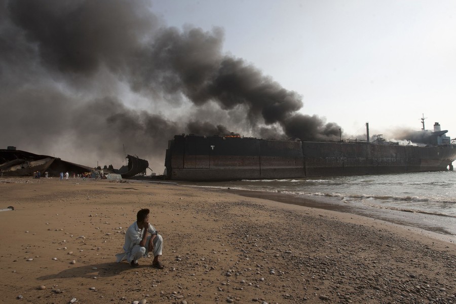 Read moreA man looks at a ship on fire in the coastal town of Gadani, Pakistan, on November 1, 2016. An explosion on the ship at a breaking yard in southwest Pakistan on Tuesday killed many laborers and wounded dozens of others. A police official says an oil tank exploded while workers were dismantling a ship, which then caught fire. Initial reports indicate dozens of laborers remain trapped after the blast. #