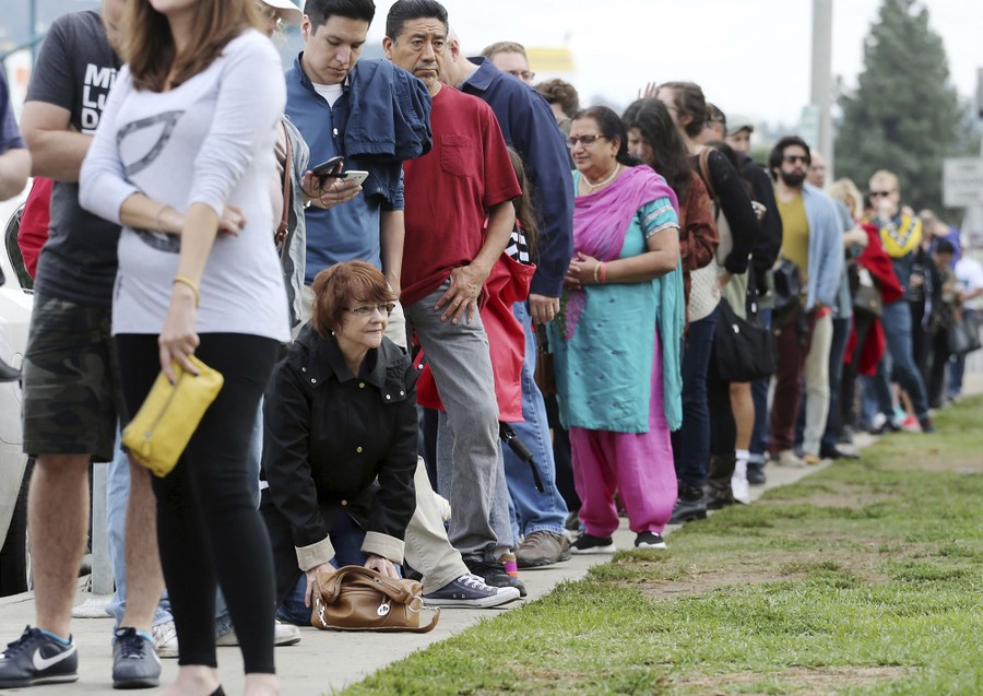 Read moreDiane Sternbach kneels to take a "back break" while waiting in line at a weekend early voting polling place at the North Hollywood branch library in Los Angeles on October 30, 2016. Los Angeles County election officials say some voters waited more than two hours to cast a ballot amid strong interest in early voting. #