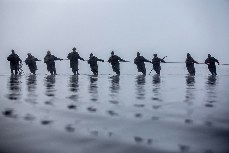 Read moreFishermen pull a net during the traditional carp haul at Zablatsky pond near the southern Bohemian town of Trebon, Czech Republic, on October 31, 2016. Carp, the traditional Czech Christmas Eve dinner served with potato salad, is fished primarily from southern Bohemian ponds with fishermen using traditional methods of catching the local carp. #