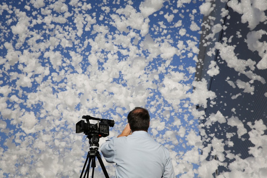 Read moreA TV cameraman films fire retardant foam blowing in the wind after a fire alarm malfunctioned in a hangar according to local media, near the San Jose airport in Santa Clara, California, on November 18, 2016. #