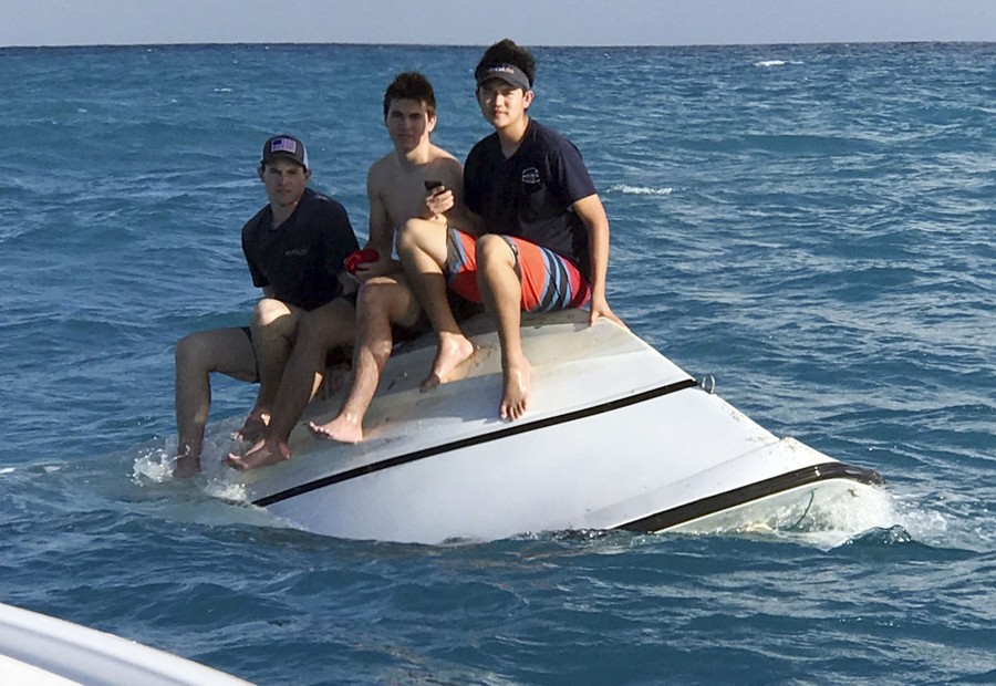 Read moreIn this December 27, 2016, photo, teenagers Zack Sowder, left, Jacob Sowder and Brent Shishido, of Orange County, California, sit on a capsized vessel offshore of Little Torch Key in the Florida Keys. The stranded teenage boys called 911 and calmly sat atop a capsized boat before being rescued, authorities said. #