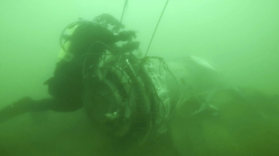 Read moreIn this still image from video, a Russian Emergency Situations Ministry diver adjusts a rope on a fragment of a plane engine, to lift it outside in Sochi, Russia, on December 28, 2016. The Defense Ministry says search teams have recovered another flight recorder from a military plane that crashed in the Black Sea, killing all 92 aboard. #