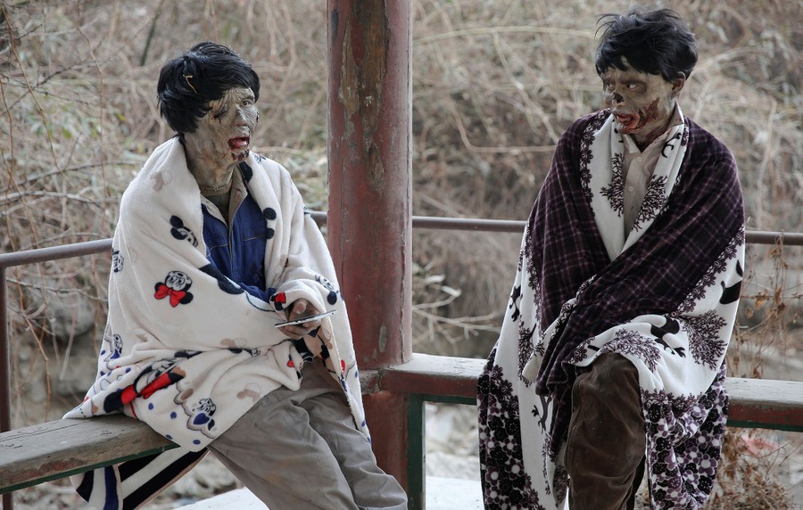 Read moreActors wrapped in blankets react at the set of the post-apocalyptic movie Zombie Era at an abandoned factory complex in Langfang, Hebei province, China, on December 16, 2016. #