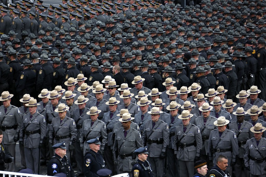 Read morePennsylvania State Troopers and police officers from around the country line up outside the Blair County Convention Center in Altoona, Pennsylvania, following a memorial service on January 5, 2017, for Pennsylvania State Trooper Landon E. Weaver who was killed in the line of duty December 30. Weaver, 23, had been on the force for less than six months. #