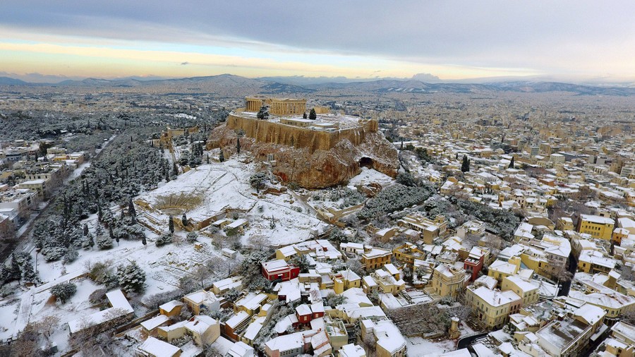 Read moreThe Parthenon temple is seen atop of the snow-covered Acropolis hill in Athens, on Tuesday, January 10, 2017. Snow closed schools in the capital, as added pressure on the government to speed up winter preparations for thousands of refugees living in camps around the country. #