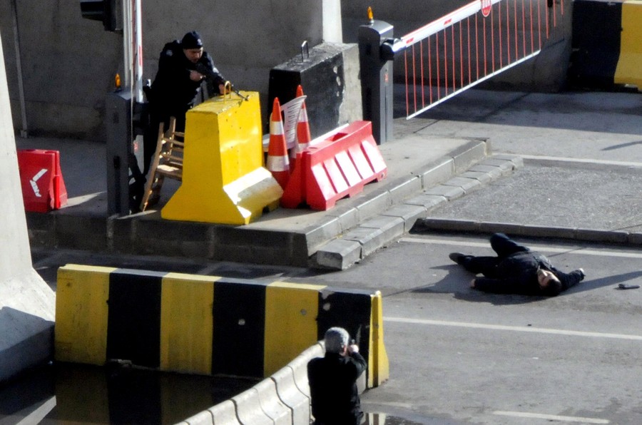 Read moreTurkish police officers point their weapons at a man lying on the ground after they shot him outside a Turkish police station in Gaziantep on January 10, 2017. A man suspected of trying to force his way into a Turkish police station in a city near the Syrian border was shot dead on january 10, local officials said. An officer was lightly wounded in the shootout at a security checkpoint outside the police headquarters in the southeastern city of Gaziantep, the governor's office said in a statement. #