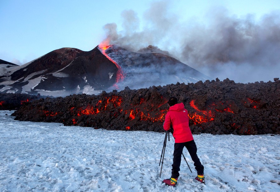 Read moreA tourist stands in front of Italy's Mount Etna, Europe's tallest and most active volcano, as it spews lava during an eruption on the southern island of Sicily, Italy, on February 28, 2017. #