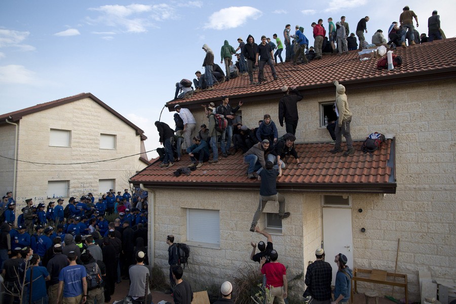Read moreSettlers climb on a roof as Israeli police carry out an eviction in the West Bank settlement of Ofra on February 28, 2017. Israeli forces began evacuating nine homes in the settlement following a Supreme Court decision that ruled they were built on private Palestinian land. #