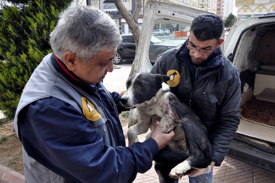 Read moreTurkish medics carry a dog that Turkish soldiers rescued from the debris of a building after an explosion in Syrian town of Al-Bab, in Gaziantep, southern Turkey, on March 2, 2017. #