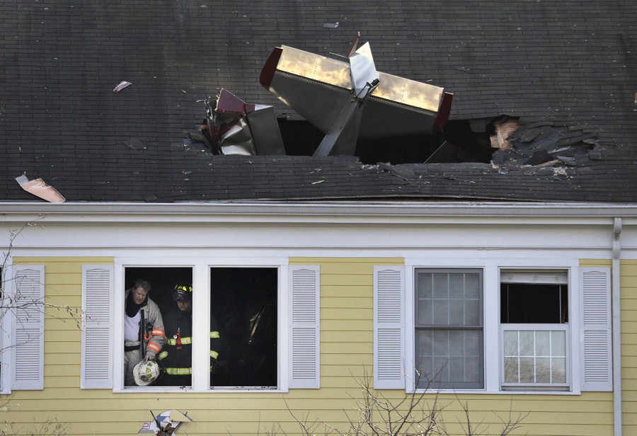 Read moreFirefighters investigate the scene after a small plane crashed into the roof of a condominium building across the Merrimack River from Lawrence Municipal Airport on February 28, 2017, in Methuen, Massachusetts. #