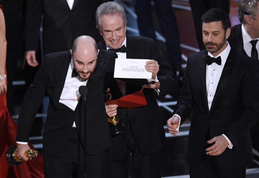 Read moreJordan Horowitz, producer of "La La Land," shows the envelope revealing "Moonlight" as the true winner of best picture at the Oscars on February 26, 2017, at the Dolby Theatre in Los Angeles. Presenter Warren Beatty and host Jimmy Kimmel look on from right. #